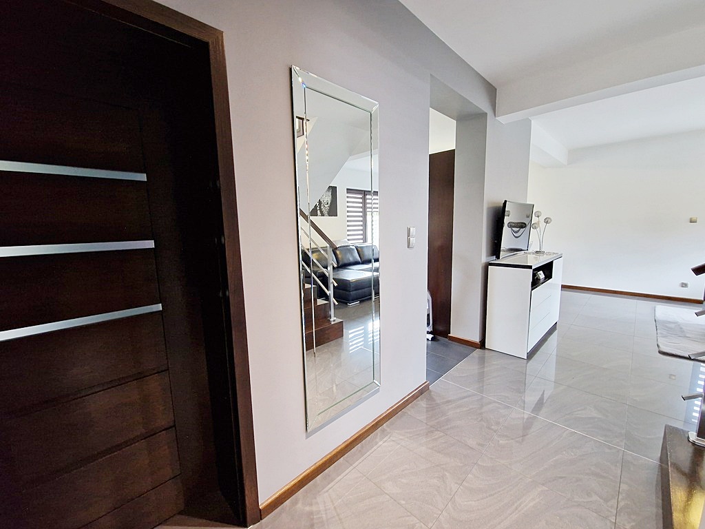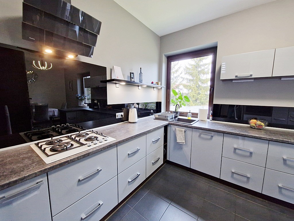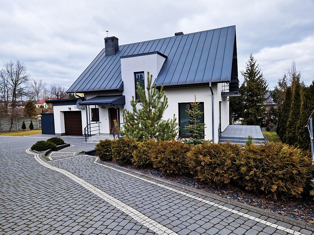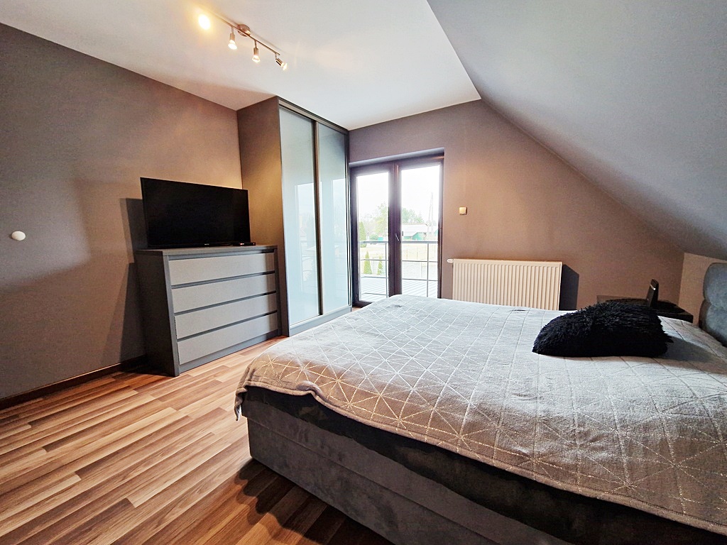 Dom jednorodzinny o funkcjonalnym układzie wewnętrznym, wybudowany w stylu klasycznym, doskonale łączy komfort z nowoczesnymi rozwiązaniami. Parter budynku prawie w całości został przeznaczony na komfortową strefę dzienną i zarazem relaksacyjną. Kuchnia w zabudowie pod wymiar z optymalną ilością blatów roboczych, wyposażona została w sprzęt AGD: lodówkę, piekarnik, mikrofalę, płytę grzewczą, okap i zmywarkę. Dębowe schody prowadzą na piętro domu. Umeblowanie oraz wyposażenie w cenie prezentowanej nieruchomości.