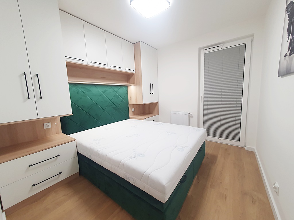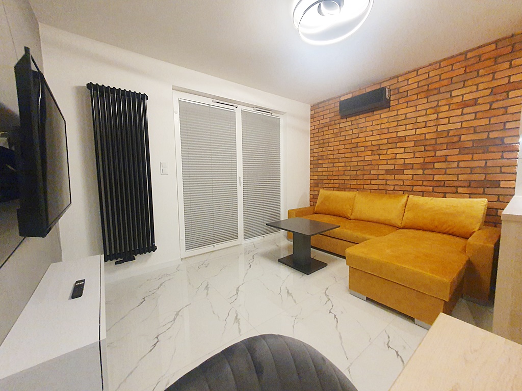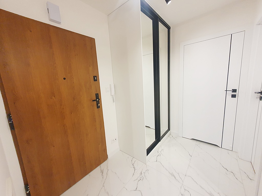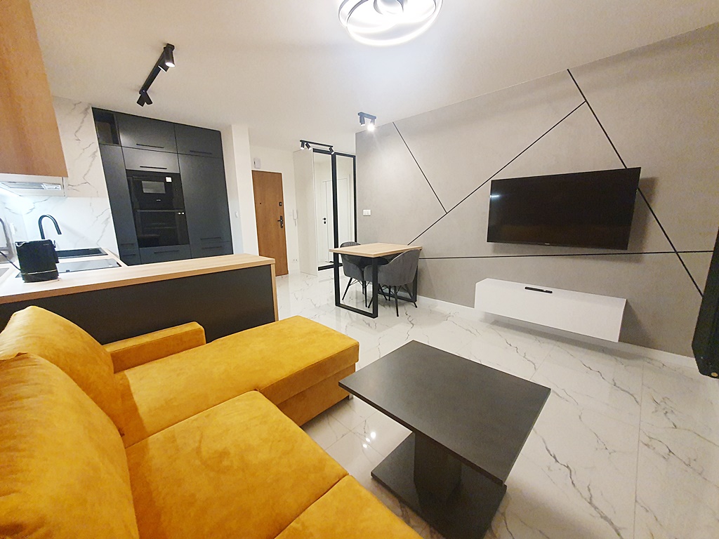 Mieszkanie środkowe jednostronne - rozkładowe, w pełni umeblowane i wyposażone w wysokiej jakości sprzęt AGD. Kuchnia połączona została aneksem kuchennym z salonem, w skład, której wchodzi: mikrofala, lodówka, piekarnik, płyta grzewcza, okap, zmywarka. W sypialni znajduję się przestronne łóżko, zabudowane szafkami wykonanymi na wymiar, wyposażonymi w podświetlenie LED. Łazienka wyposażona została w wannę z funkcją prysznica, a także w pralkę. Atutem mieszkania jest przestronny taras, biegnący po całej szerokości mieszkania, połączony z salonem i sypialnią, z którego rozpościera się panorama miasta. Dodatkowym udogodnieniem jest zamontowana klimatyzacja. Nieruchomość została zaprojektowana z myślą o funkcjonalności oraz wygodzie, z wysokiej jakości materiałów. Teren wokół budynku został ogrodzony, zabezpieczony domofonem. Dodatkowo wokół apartamentu, zainstalowany został monitoring.