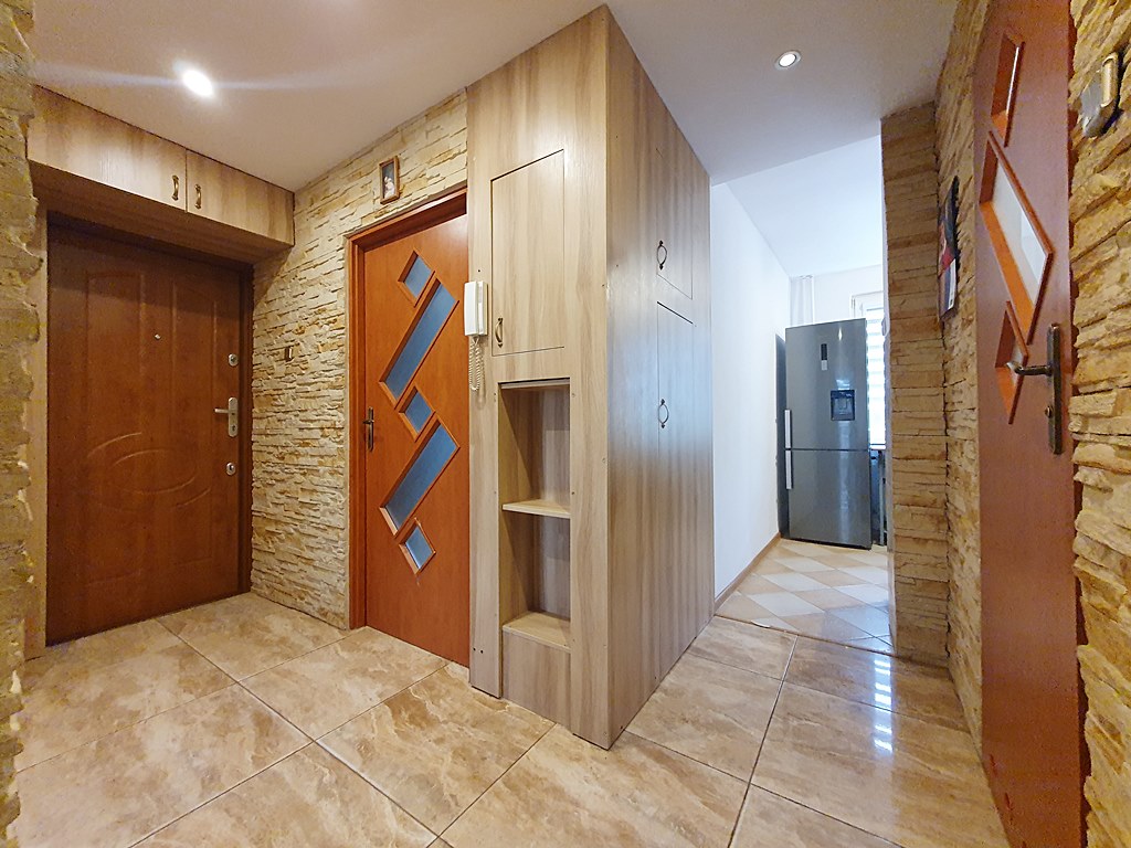 Mieszkanie środkowe dwustronne - rozkładowe, w pełni umeblowane i wyposażone. Kuchnia zaopatrzona została w lodówkę, kuchenkę gazową, piekarnik, mikrofalę, okap, zmywarkę. Sypialnie natomiast w biurko, dwie szafy, dwie komody, telewizor. Salon umeblowany został w łóżko, dwie szafy, stolik kawowy. W łazience znajduje się prysznic, pralka oraz WC. Dodatkowym udogodnieniem jest szafa w zabudowie, znajdująca się w przedpokoju oraz przestronny balkon.