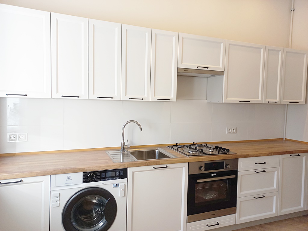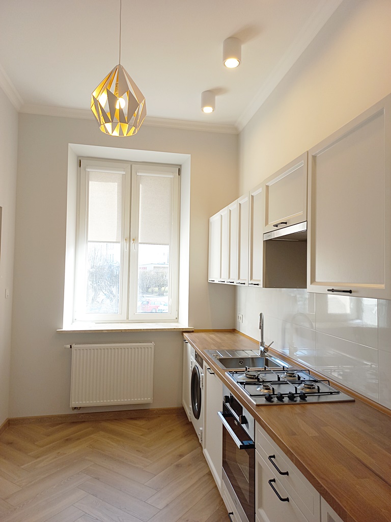 Osobna, widna kuchnia umeblowana i wyposażona została w lodówkę, kuchenkę gazową, piekarnik, okap i pralkę. Możliwość umeblowania pokoi przez właściciela. W sypialni zostało wyodrębnione miejsce na garderobę. Dużym atutem są również dodatkowe drzwi do łazienki oraz przejście do kuchni. W łazience kabina prysznicowa, umywalka oraz WC. Wszystko zostało starannie wykończone.