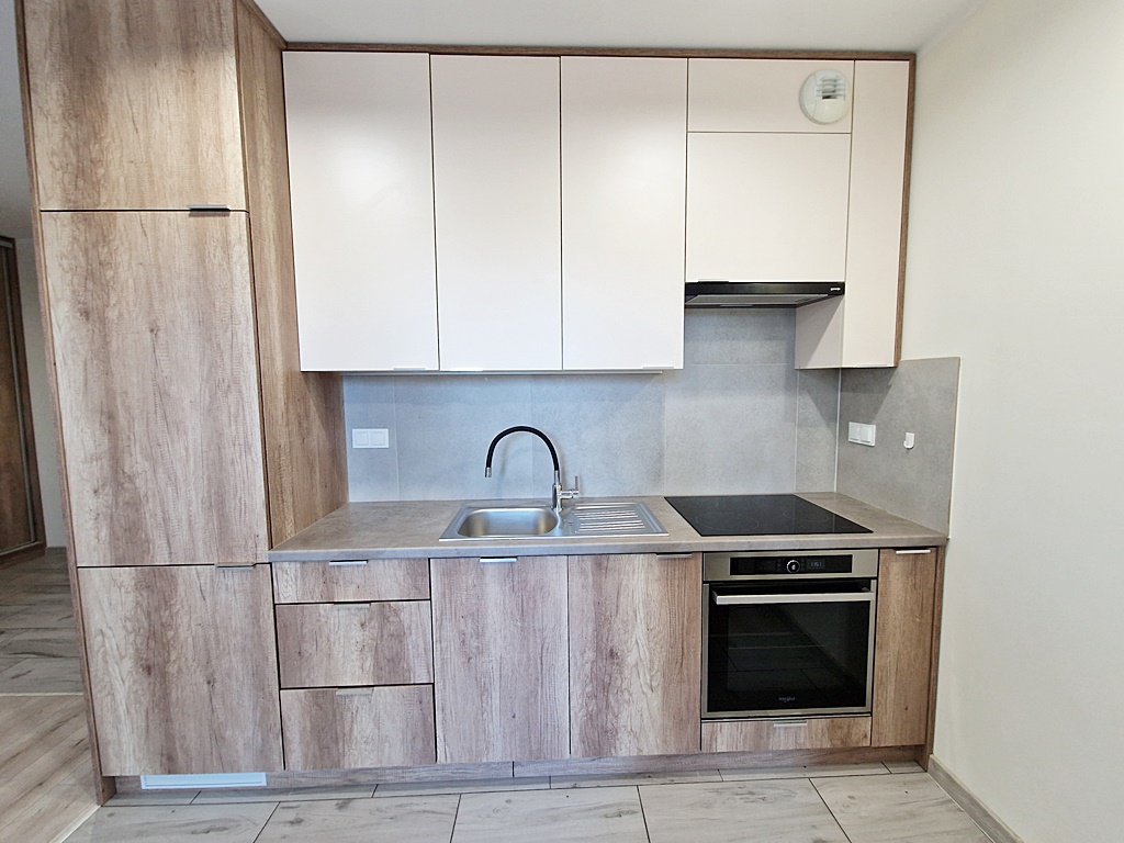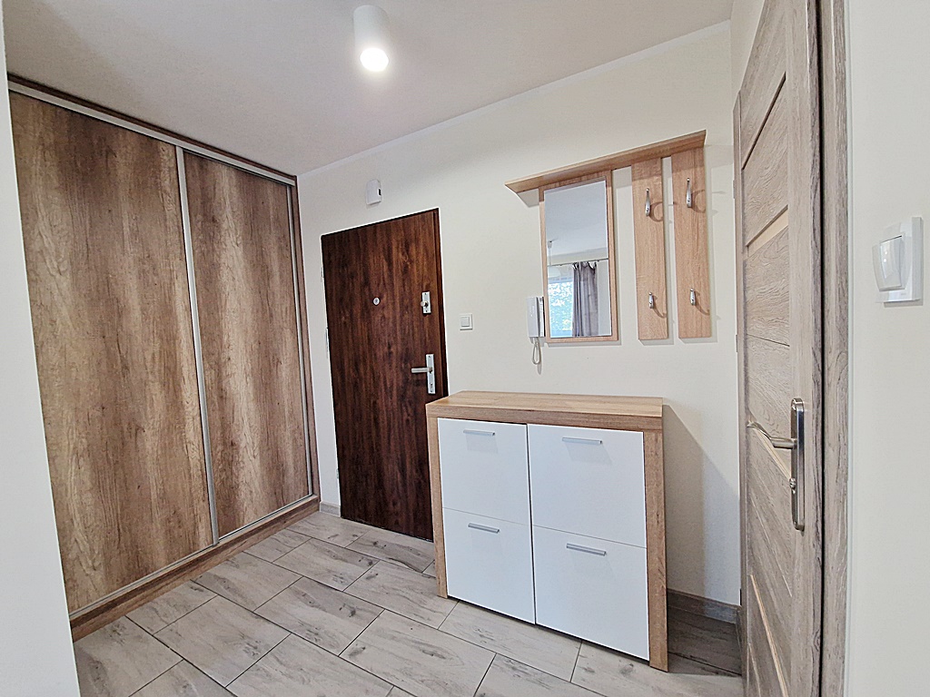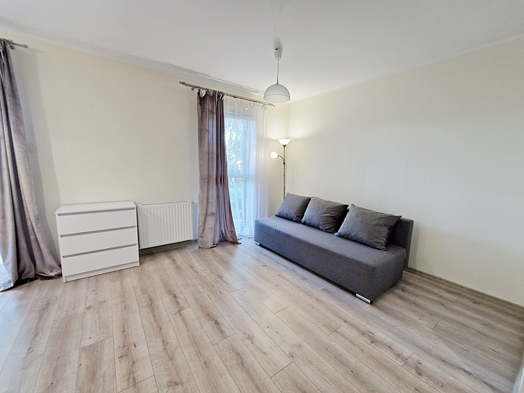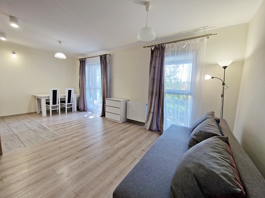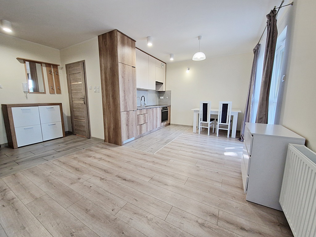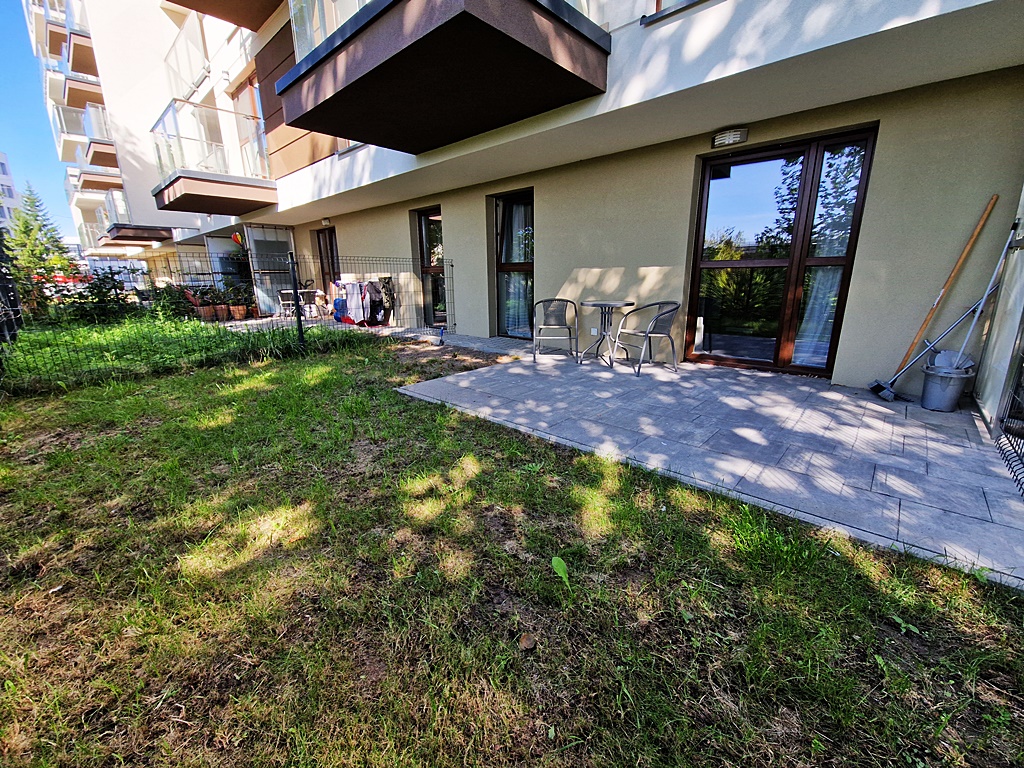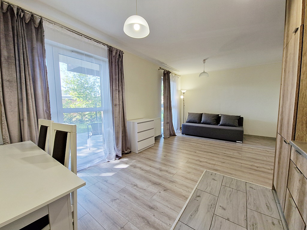 Mieszkanie środkowe jednostronne - rozkładowe. Lokal umeblowany i wyposażony w sprzęt AGD. Salon połączony został z aneksem kuchennym w skład, której wchodzi: lodówka, piekarnik, płyta grzewcza, okap. Atutem mieszkania jest przestronny ogród, biegnący po całej szerokości mieszkania (dwa wyjścia). Nieruchomość została zaprojektowana z myślą o funkcjonalności oraz wygodzie. Teren wokół budynku został ogrodzony, zabezpieczony domofonem. Dodatkowo wokół apartamentu, zainstalowany został monitoring.