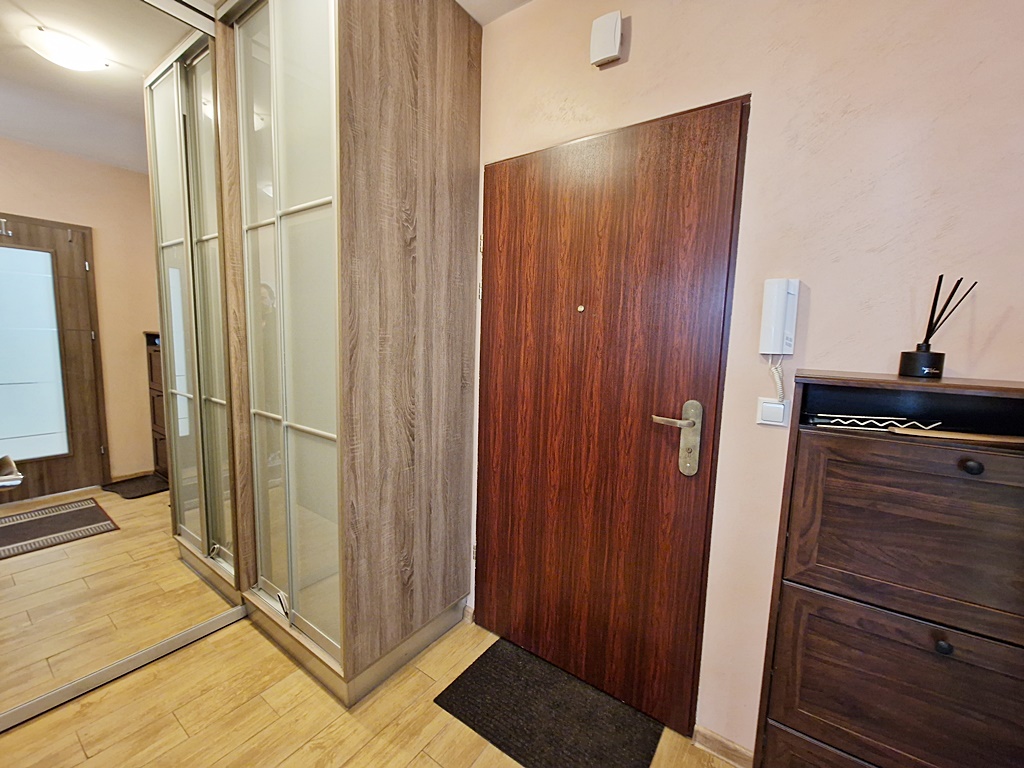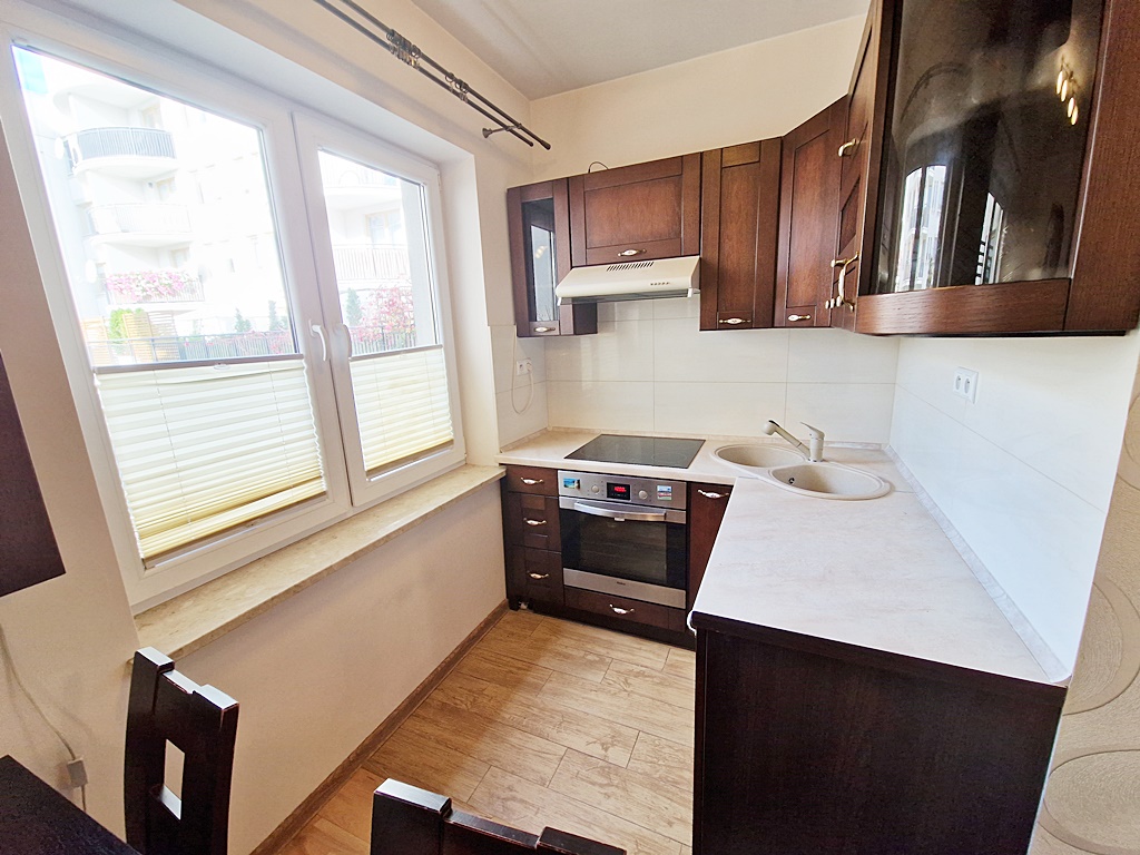 Lokal komfortowo wykończony, umeblowany i wyposażony. W pokojach na podłogach panele, na ścianach gładzie. Kuchnia wyposażona w lodówkę, płytę grzewczą, piekarnik i okap. W łazience płytki oraz wyposażenie: pralka, prysznic, umywalka oraz WC.