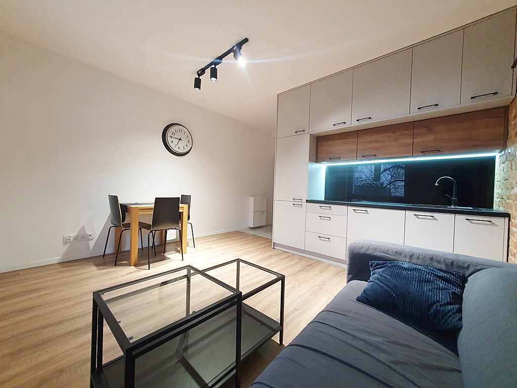 Mieszkanie środkowe jednostronne - przejściowe, umeblowane i wyposażone. Salon połączony został z aneksem kuchennym, wyposażonym w niezbędny sprzęt AGD. W sypialni znaleźć można duże łóżko, przestronną szafę oraz szafkę nocną. Łazienka wyposażona została w prysznic oraz WC. Atutem nieruchomości jest balkon, połączony z sypialnią.