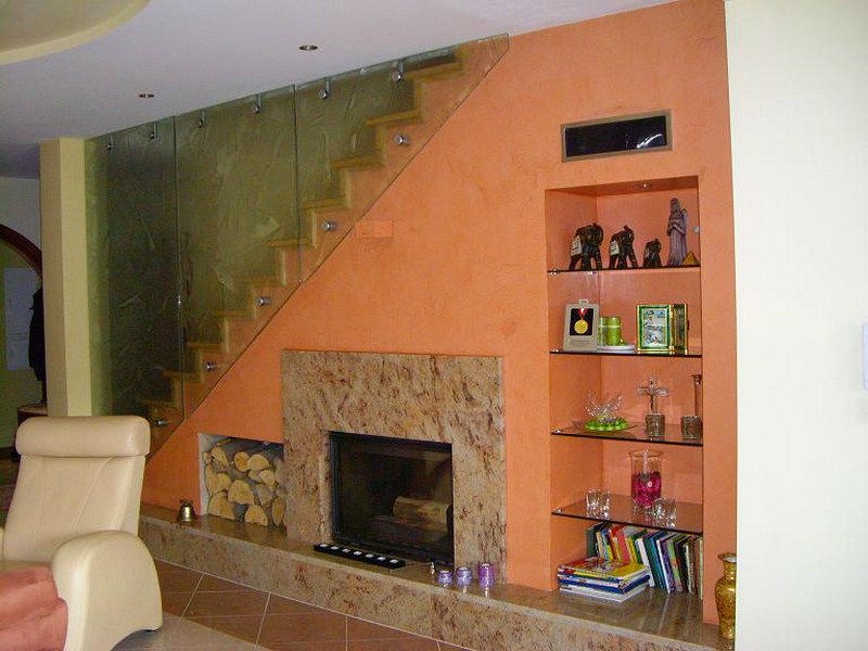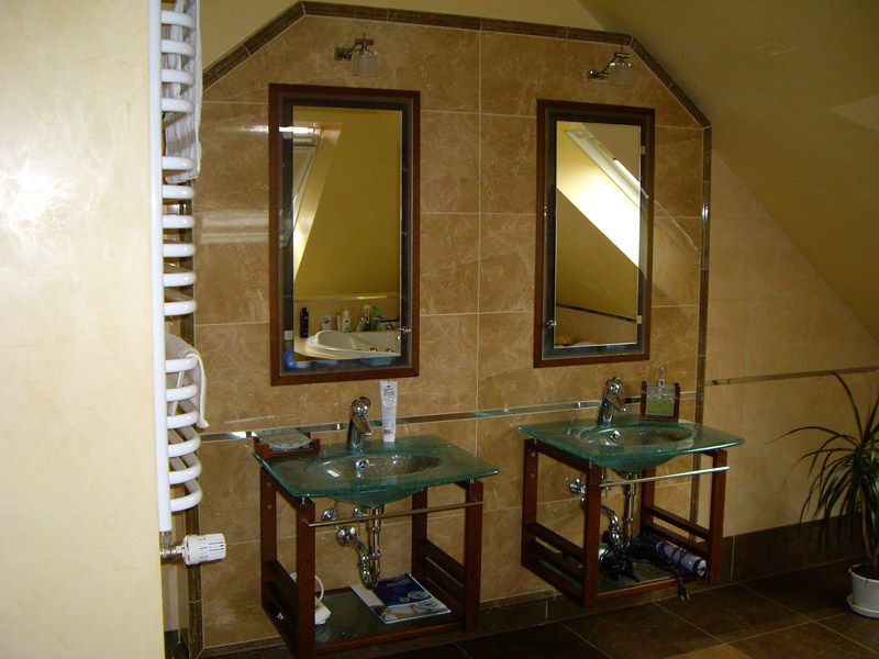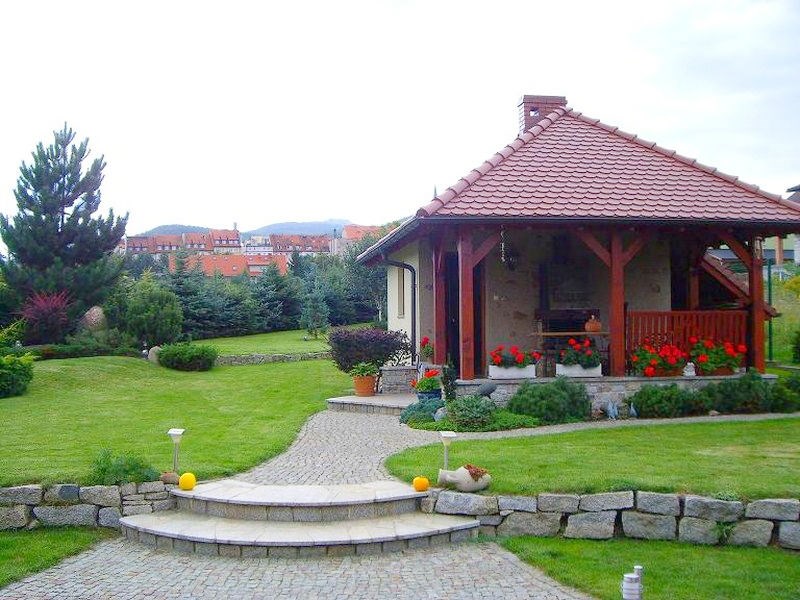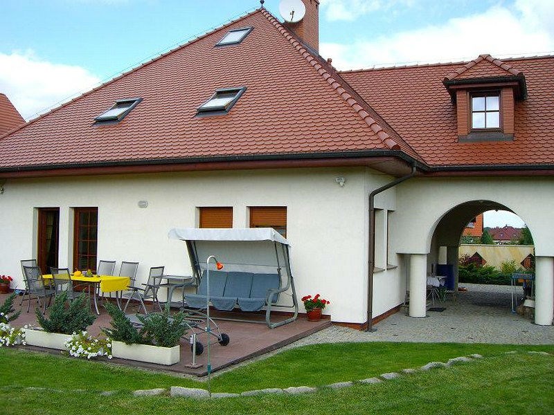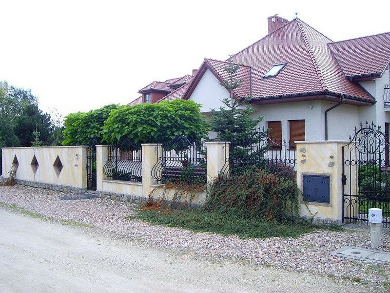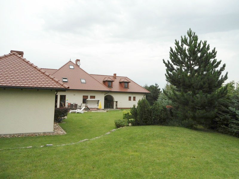 Nieruchomość położona na skraju osiedla nowych domów jednorodzinnych. Dojazd do osiedla drogą asfaltową. Plac manewrowy przed garażem wyłożony kostką granitową. Działka w całości ogrodzona – od frontu mur lany z elementami metolowami (kute kraty stalowe, ocynkowane i malowane proszkowo), z pozostałych stron siatka stalowa na fundamentach o podwyższonej wysokości (również malowana proszkowo). Brama wjazdowa, bramy garażowe oraz rolety zewnętrzne (zarówno w oknach i na drzwiach) zamykane elektryczne. Całość powierzchnia działki bardzo ładnie zagospodarowana na cele rekreacyjne – ładne nasadzenia oraz dodatkowo domek letniskowy z wydzielonym miejscem do grilowania. Na działce zamontowane automatyczne zraszacze. Z salonu oraz jadalni wyjścia na tarasy wykonane z kamienia Wanga. Dom wybudowany według projektu firmy Studio Atrium GLX35. Do budowy użyto wyłącznie materiałów najwyższej jakości. Dach kryty dachówką ceramiczną pokrytą angobą, rynny miedziane. Drzwi zewnętrzne i stolarka okienna drewniana – mahoń, drzwi wewnętrzne oraz schody dębowe. W środku na podłogach parkiet jesionowy oraz włoskie kafle. Powierzchnia całkowita wynosi ponad 380m2, a użytkowa ok. 210 m2. Na parterze znajduje się przestrzonny salon z kominkiem, duża zabudowana meblami pod wymiar (czereśnia) wraz ze sprzętami firmy Siemens kuchnia połączona z jadalnią, spiżarnia, kotłownia z pralnią, pokój gościnny, łazienka z prysznicem i WC, oraz osobna toaleta. Na piętrze znajdują się trzy sypialnie, duża garderoba, przestronna łazienka z hydromasażami w wannie i kabinie prysznicowej, podwójną umywalką oraz znajdujące się nad garażem i łącznikiem pomieszczenie o powierzchni 63,4 m2 przeznaczone docelowo na salę ćwiczeń. Dodatkowo poprowadzono schody na poddasze i wygospodarowano tam dodatkowe pomieszczenie mogące służyć np. na gabinet. Dom ogrzewany gazem ziemnym – nowy, bardzo wydajny piec Viessmann. Ogrzewanie na dole i górze zarówno tradycyjne oraz podłogowe. Nieruchomość posiada system centralnego odkurzacza, system alarmowy oraz system monitoringu! Z głównym budynkiem łączy się za pomocą wiaty duży garaż na dwa samochody.